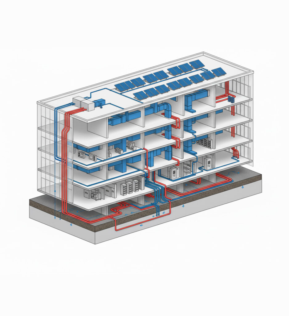 Estudio, dimensionado y verificación de la puesta en marcha de instalaciones de obra nueva y rehabilitación. Integramos soluciones eficientes conforme a normativa coordinándonos con la empresa instaladora del promotor para asegurar rendimiento y ahorro a largo plazo.